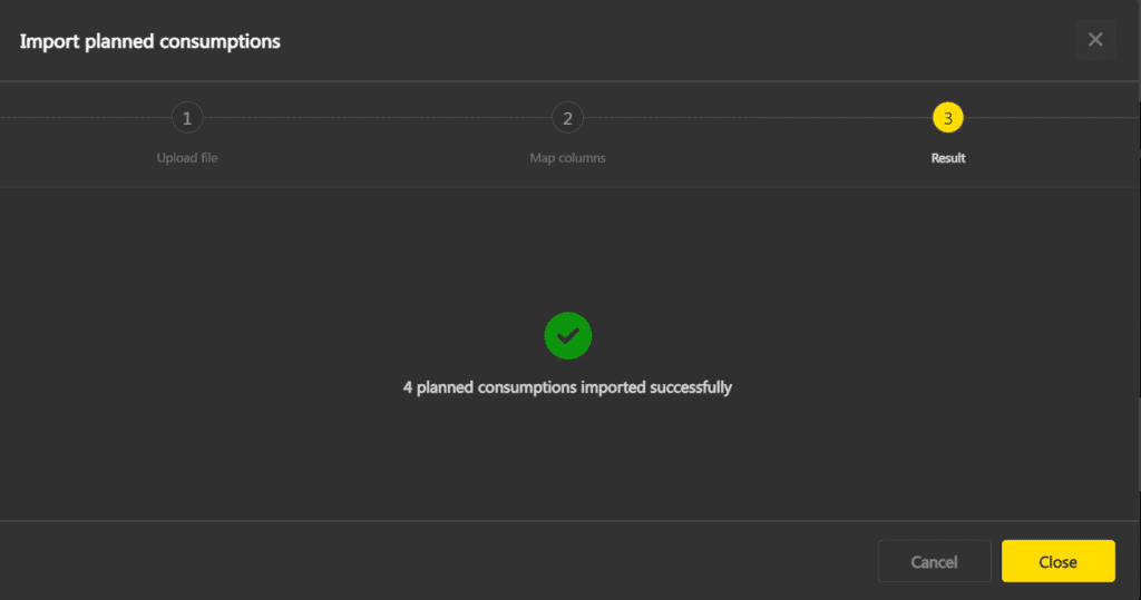 The import feature allows you to upload a file containing multiple planned consumptions at once. Imported consumptions are added to existing consumptions.