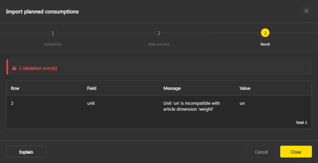 | Unit incompatible with item dimension | The specified unit does not match the item dimension (e.g.: kg for a quantity item). | Use a unit compatible with the item dimension. Click Explain to see the valid units. |