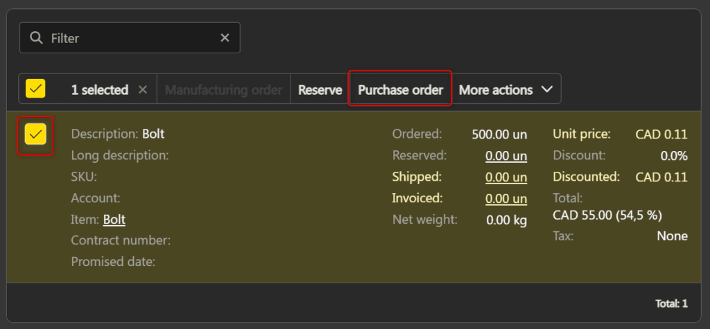 - In the ordered items section, select one or more purchasable item lines. Click Purchase order in the action bar.