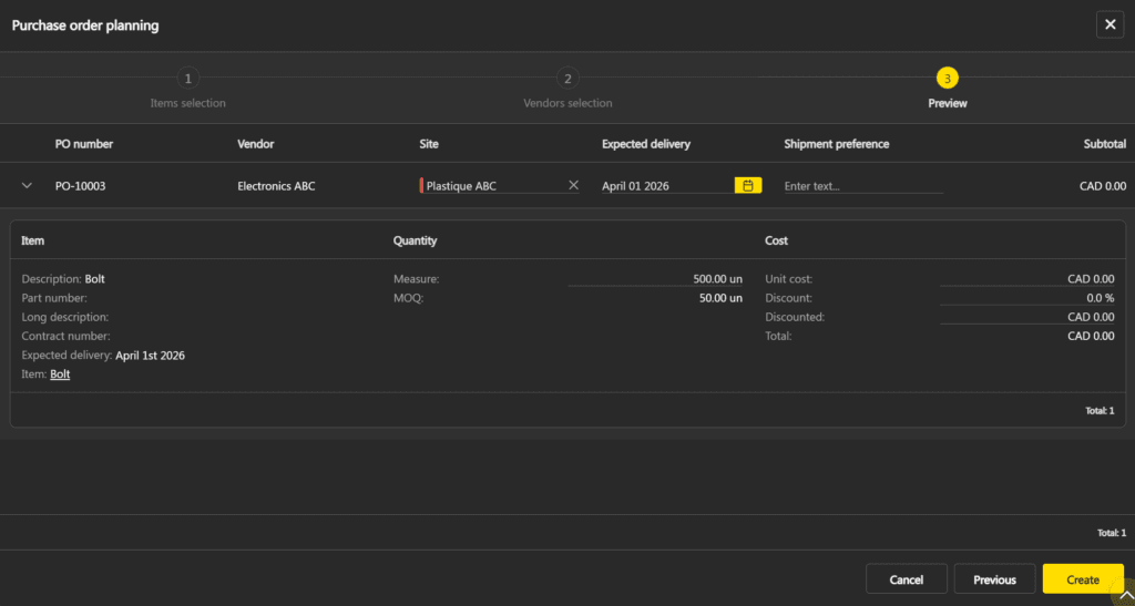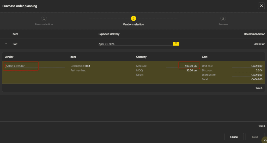 - The Purchase order planning window appears. Select the desired vendor, then verify the proposed measure. By default, the measure corresponds to the unreserved quantity of the line. It is possible to modify the measure to create a partial purchase order.