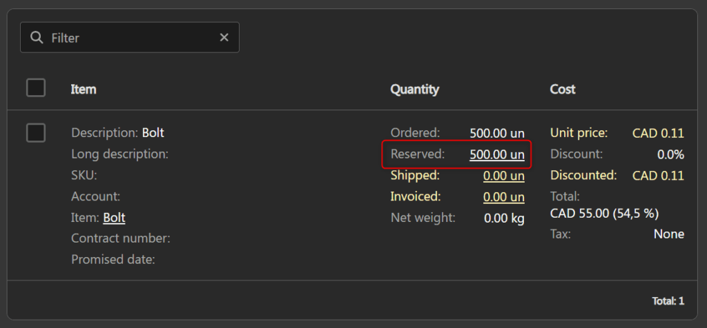 - The purchase order is created with the Draft status. The Reserved column of the item line is updated in the sales order. The Purchase order button remains active as long as there is unreserved quantity remaining, allowing you to create additional purchase orders as needed.