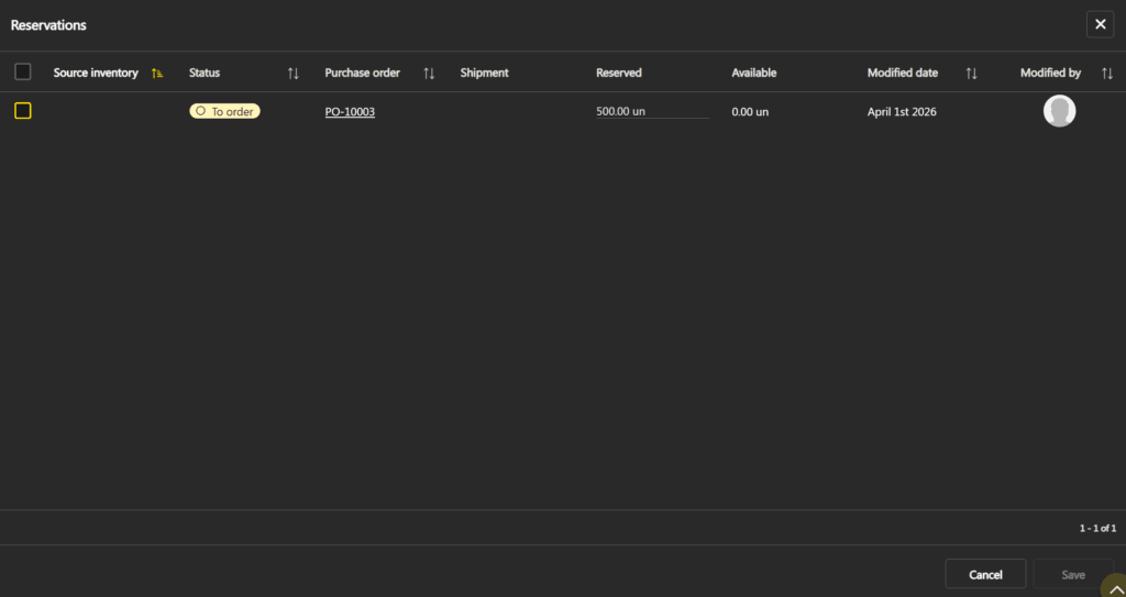 | Ordered | The purchase order has been issued. An inventory with the Ordered status is associated with the reservation. |