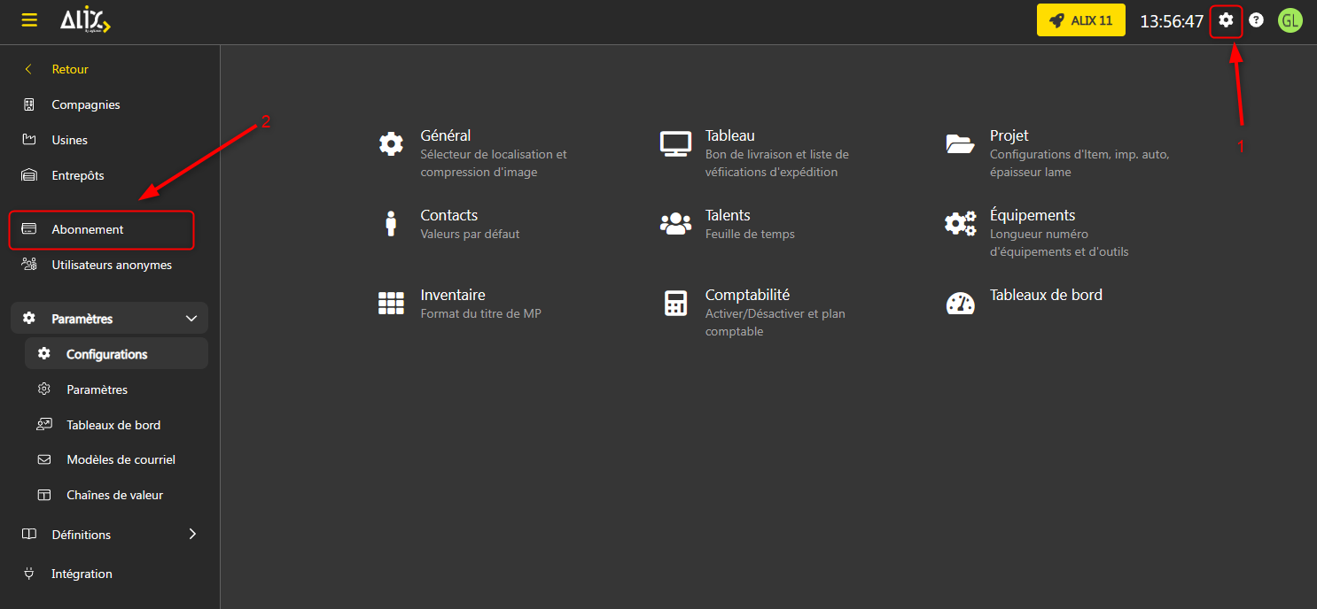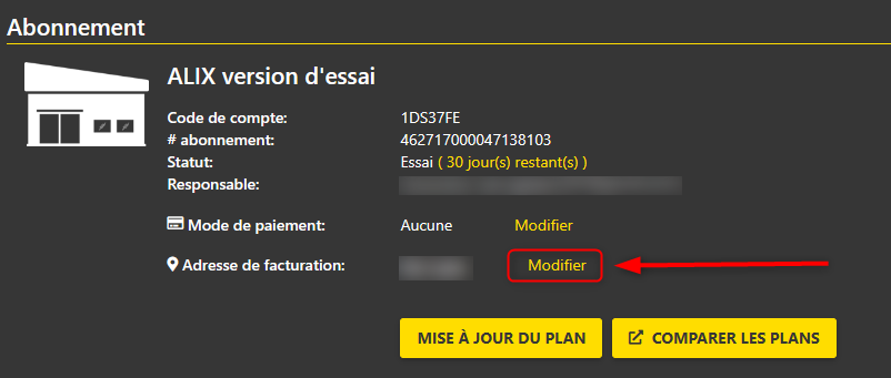 Abonnement Plans d’ALIX Activer l’abonnement après la période d’évaluation gratuite Mettre à jour les informations de paiement Mettre à jour le plan Modifier les limites d’utilisateurs