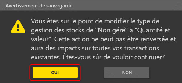 | Transactions actives | Les articles seront maintenant gérés selon le nouveau type de gestion choisi. |