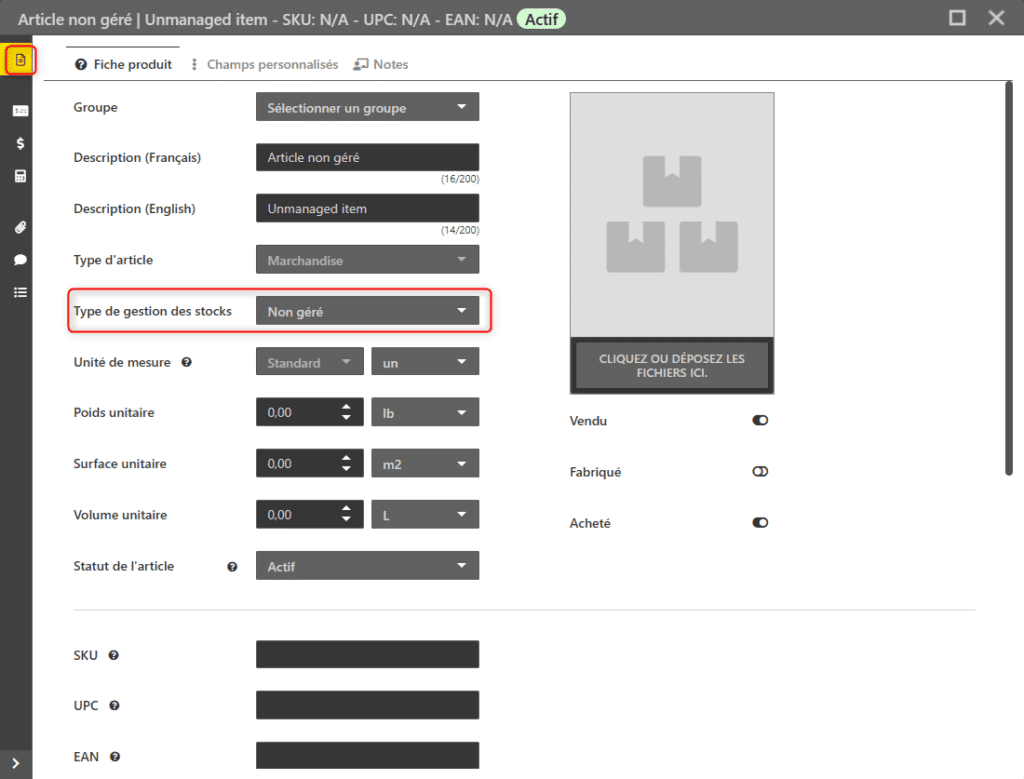Le choix du type de gestion des stocks se fait lors de la création de l’article et est définitif, sauf pour le type Non géré, qui peut être modifié par la suite.