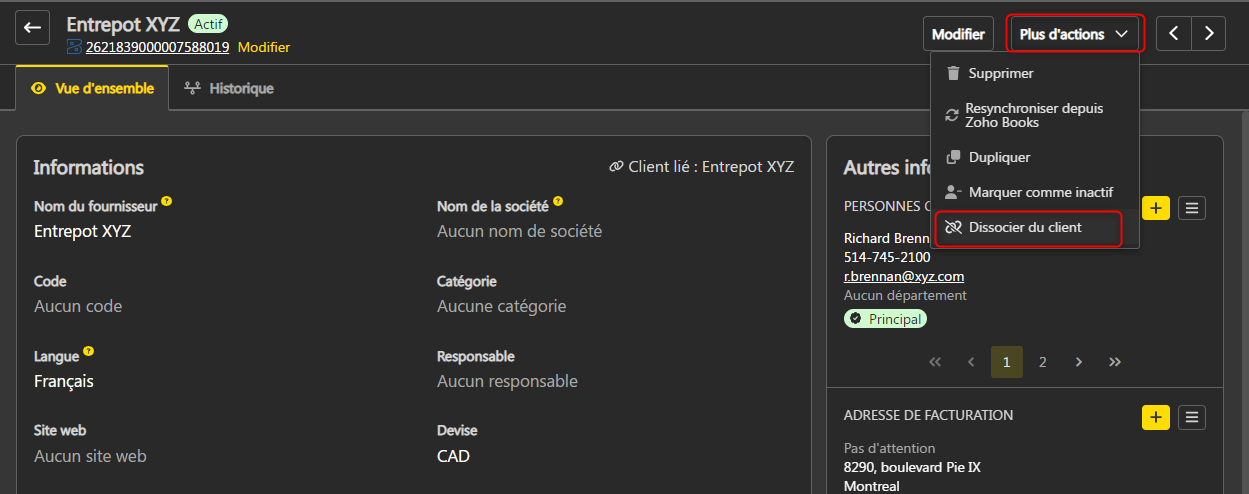 - Dans le menu Plus d’actions en haut à droite, sélectionnez Dissocier un client ou Dissocier un fournisseur.