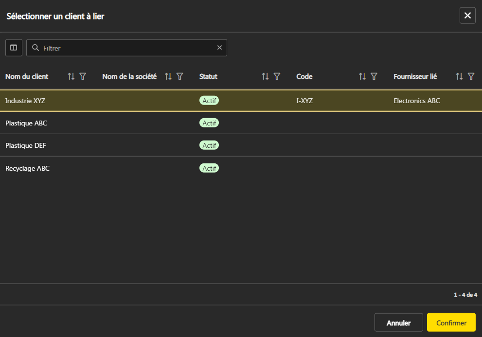 - Sélectionnez le client/fournisseur à lier dans la liste proposée.