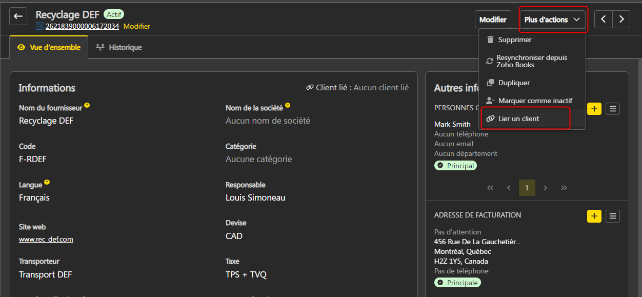 - Dans le menu Plus d’actions en haut à droite, sélectionnez Lier un client ou Lier un fournisseur.