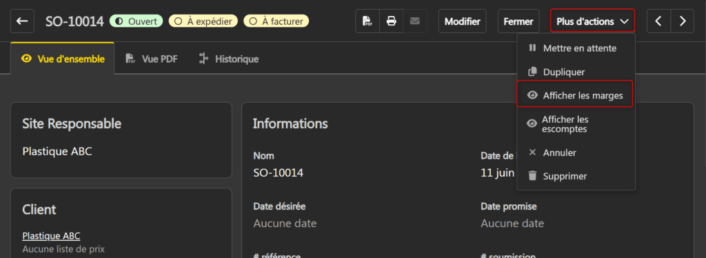 Note : les marges n’apparaissent pas dans la vue PDF envoyée au client.