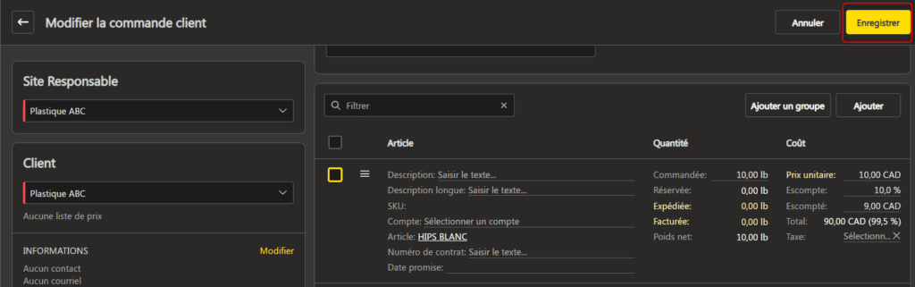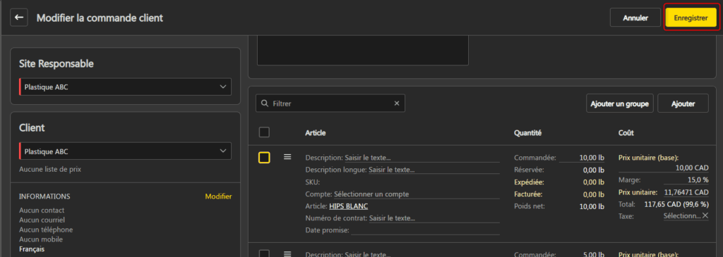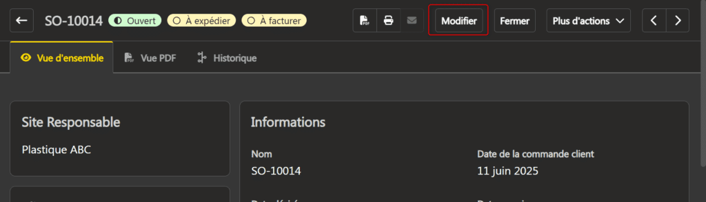 - Dans la commande client, cliquez sur Modifier en haut à droite.