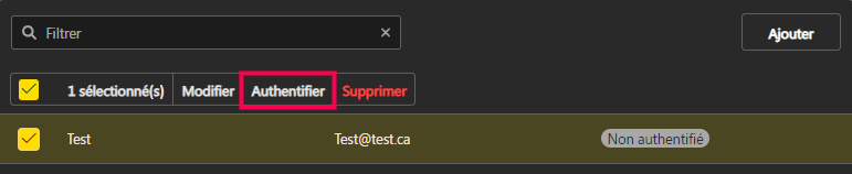 - Sélectionner l’adresse courriel que vous venez d’ajouter, puis cliquez sur Authentifier.