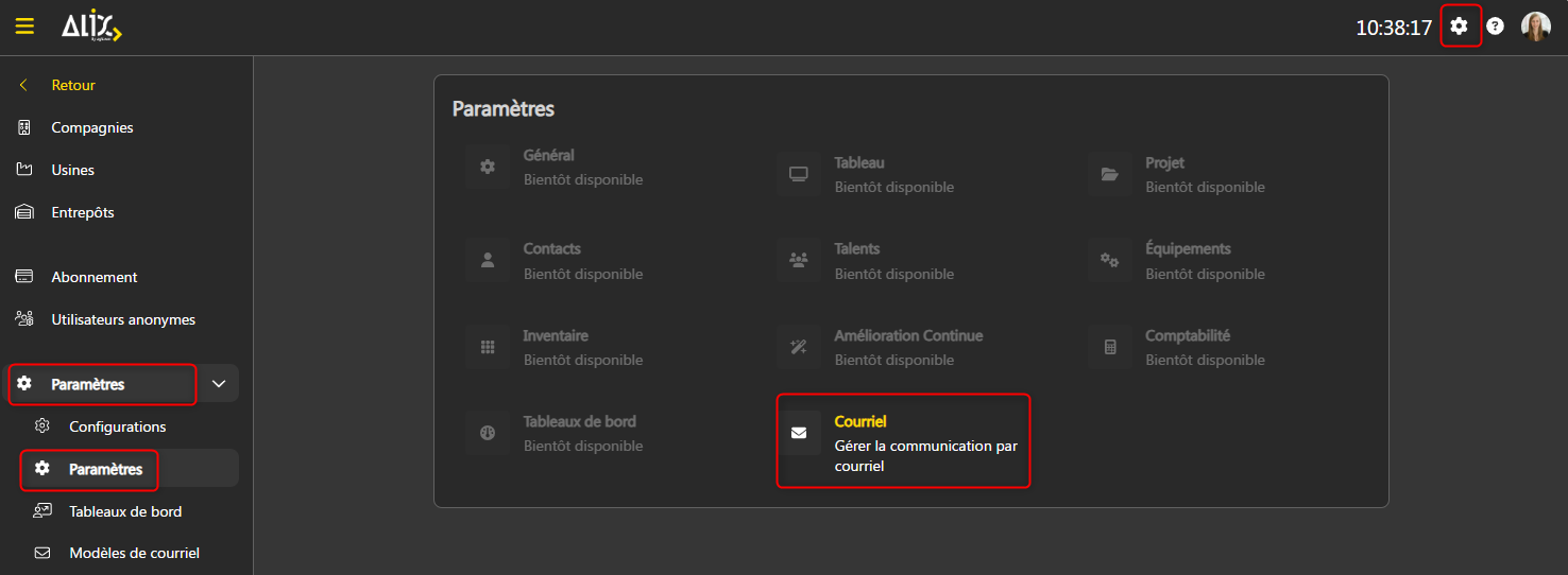 - Dans les Paramètres, allez dans la section Paramètres, puis Paramètres. Cliquez sur Courriel.