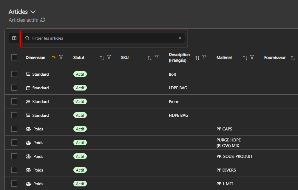 À plusieurs endroits dans ALIX, vous pouvez effectuer une recherche pour filtrer des éléments d’une liste. Voici un exemple dans le module d’articles :