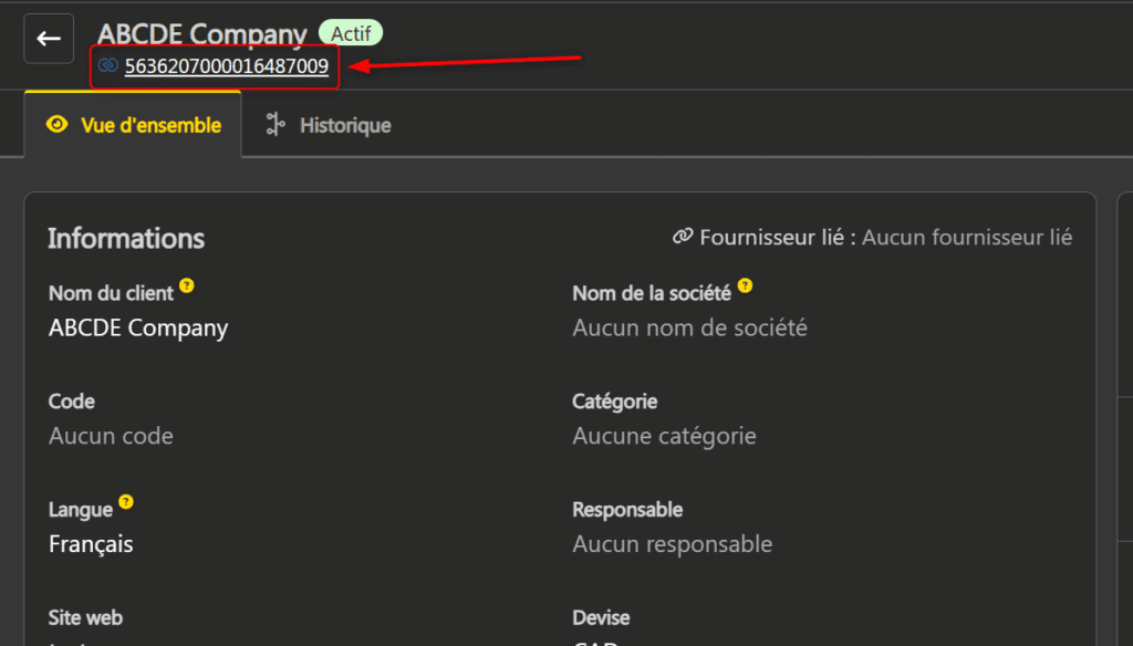 Lorsqu’un client est synchronisé avec Zoho CRM, un identifiant ID CRM est affiché dans la section des services externes de l’entête de la fiche client.