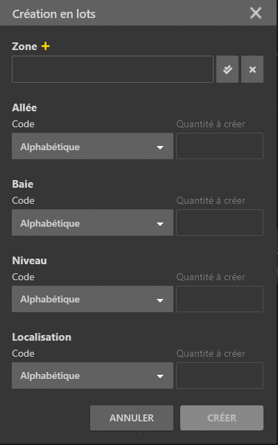 La création en lot permet de déterminer les éléments de la structure et de créer les localisations en même temps. Vous pouvez spécifier la quantité voulue de chaque niveau de la hiérarchie, puis laisser ALIX créer toute la structure pour vous.