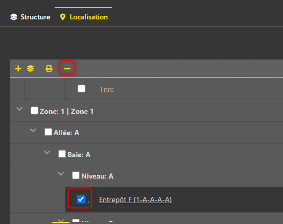 Il est possible de supprimer un entrepôt seulement si aucune localisation sous sa structure n’est utilisée.