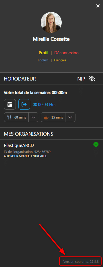 - Pour savoir quelle est la version courante d’ALIX, cliquez sur votre photo en haut à droit de l’écran.