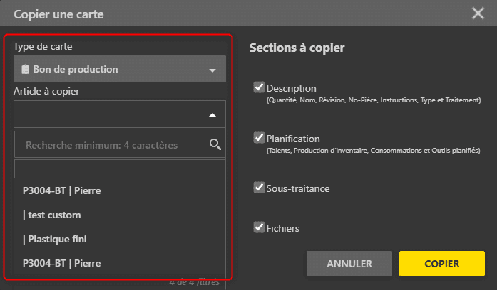 - Sélectionnez Bon de production, puis sélectionnez l’article à copier dans la liste.