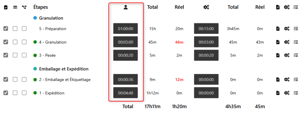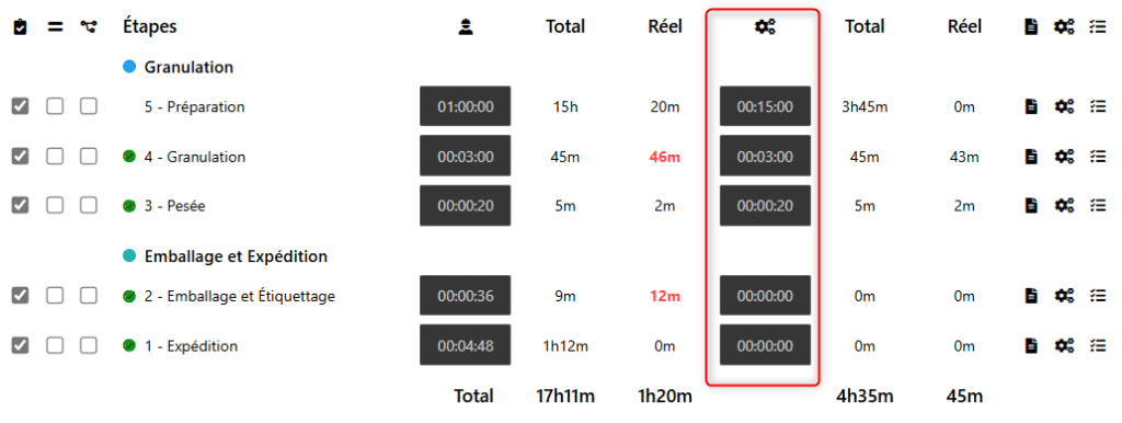 | Heures planifiées Équipement étape | Opérations -> Choisir une carte -> Étapes -> Colonne Équipement