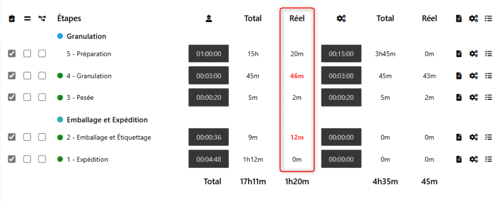 | Heures réelles Équipement | Opérations -> Choisir une carte -> Étapes -> Colonne Réel Équipement