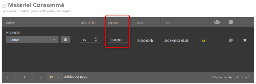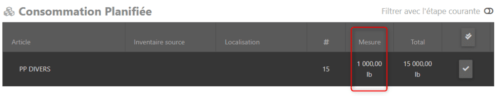 | Mesure réelle | Opérations -> Choisir une carte -> Consommation -> Colonne Mesure de la section Matériel Consommé